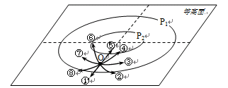 3、单选题 图示意某一等高面。P1、P2为等压线,P1、P2之间的气压梯度相同。①~⑧是只考虑水平受力,不计空气垂直运动时,O点空气运动的可能方向。回答各题。