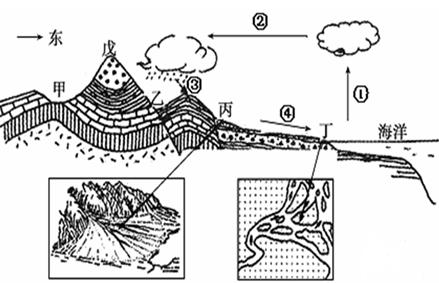 (2)从地质作用看,乙处由 作用形成,丙、丁处由 作用形成。