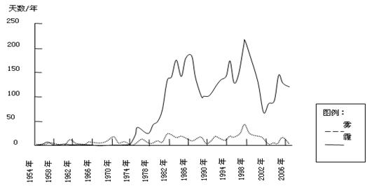 霾(mái),空气中因大量烟、尘等微粒悬浮而形成的浑浊现象。下图为广州地区雾、霾日的长期变化趋势图。读图回答问题。