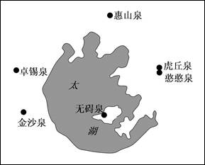 图示意环太湖地区六大名泉分布。历史上六大名泉都以水质优而著称。周围山区是这些名泉的水源补给区。近年来,泉水受到污染,部分污染物指标超出国家饮用水标准。