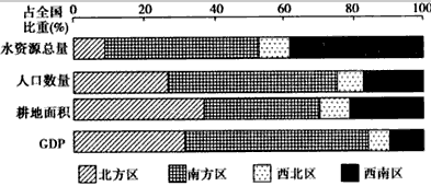 5、单选题 读“2006年我国水资源、人口、耕地和经济总量区域比重图”,完成1—2题。
