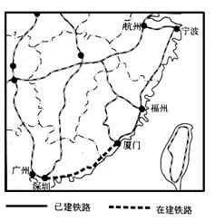 5、单选题 我国正在建设杭州一宁波一福州一厦门一深圳的沿海高速客运铁路,它对东南沿海的发展将起到促进作用。图示为我国东南部部分铁路网图。读图回答1—3题。