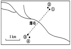 2、单选题 我国1 000多年前的古文字留下这样的记载:古人把财宝藏于“右岸,自飞瀑右行八百步”(注:这里的八百步相当于现在1 108米。据《孙子算经》)。经现代考证该地岩石为比较容易被侵蚀的砂岩组成。上右图为目前该瀑布位置示意图,读图回答问题。