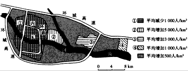 4、单选题 下图为“我国1990~2007年某城市各区人口密度变化示意图”。读图回答1—2题。