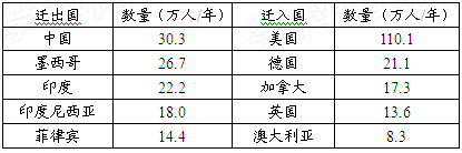 本题解析:1.本题考查地理图表的判读能力。影响人口迁移的主要因素有经济因素、战争、宗教、社会变革、国家政策、生态环境变化、个人动机和需求等。目前影响人口迁移的主要原因是地区经济发展水平的差异。表格显示迁入国主要为发达国家。所以本题选择B选项。
