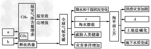 (2)根据图乙全球气候变暖成因与危害之间的关系,把以下选项填入各字母:①极冰融化②燃烧矿物燃料③沿海低地被淹④毁林。
