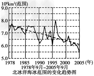 (1)读图甲,从北冰洋海冰范围的变化趋势可以看出1978年到2005年全球气温呈趋势。