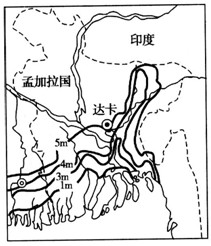 4、单选题 下图为受到不同程度的海平面升高影响的孟加拉国土地示意图。读图,回答1~2题。