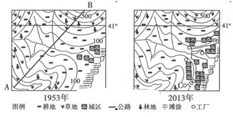 3、综合题 (24分)读“我国东部某地1953年和2013年土地利用变化示意图”,回答下列问题。