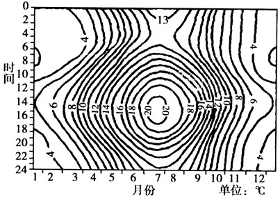 材料一:某地“全年逐日逐时平均气温(30年平均)的等温线图”(图甲)。这种气候图与其他气候图相比较,更能反映与农林生产相关的气温分布实况。
