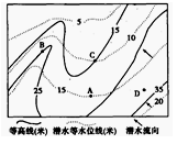 3、单选题 潜水等水位线图就是潜水面等高线图,它是根据潜水面上各点的水位标高绘制成的,一般绘制在地形图上,绘制的方法与绘制地形等高线的方法类似。读“潜水等水位线图”,回答下面问题。