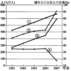3、单选题 下图示意我国某特大城市1983~2007年的总人口、城市人口、农村人口、城市化水平的变化情况。读图完成下列各题。