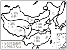 小题1:图中①②③④是我国四个地理区域,由各区的面积和人口比,可知人口密度最大的区域是?