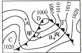 (3)冷锋为下图中的 ,暖锋为下图中的 ,假如冷、暖锋面均能引起降水,冷锋雨区在 侧四周,暖锋雨区在 侧四周(填“甲”、“乙”、“丙”或“丁”。