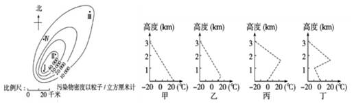 小题2:观察该市4月份气温垂直分布图,甲乙丙丁四图中大气污染最严重的是(? )