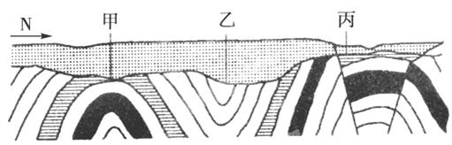 (3)在地貌上,甲构造顶部岩层缺失的原因是 ;褶皱构造上覆岩石是由________作用形成的。(2分)