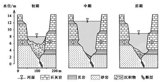 3、单选题 下图示意某河谷断面经历的一次洪水过程。读图,回答下题。