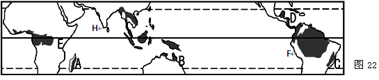 (2)?F在秘鲁西海岸,受秘鲁寒流(上升补偿流)影响,冷海水上泛,带来丰富的饵料,因此形成世界著名的秘鲁渔场。