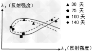 3、单选题 判读卫星遥感图像时常使用对比分析法,即对不同时间、不同地面物体的卫星图像进行对比和分析。如下图,虚、实两线分别代表玉米和大豆两种农作物在不同时间对两种不同电磁波的反射强度。(图中天数指播种后的天数)