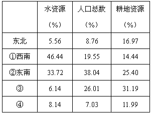 2、单选题 ? 读我国东北、华北、西北、东南、西南五个地区水资源、人口总数、耕地资源占全国比例比较表,回答1—2题。