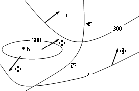 本题解析:本题考查等高线地图。注意等高线的高低方向,根据河流经过的地形为山谷(等高线应为“凸高为低”),而河流集水方向为垂直于等高线由高处流向低处,故①箭头正确。根据河流经过的地形应为山谷,等高线应为“凸高为低”,判断等高线a>b,则a的数值为500;根据等高线闭合中心“高于高值,低于低值”的原则,判断b的数值应低于300,但不超过1个等值距,即大于100.故选C项。