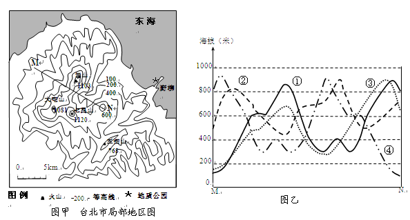1.游客出发前观察图甲,判断图示地区的河流流向特点是2.游客从M走到N,其所经地区地势起伏与图乙所示剖面线对应的是3.到野柳地质公园游览的游客,多去欣赏海边奇岩怪石的自然景观,最著名的如女王头、烛台石、龙头石等。形成这些奇岩怪石的主要作用是