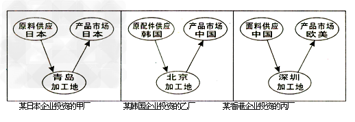 1、单选题 下图为三家企业投资建厂的原料地、加工地和产品市场示意图。吸引它们在我国东部沿海地区三地投资办厂的最主要因素分别是?