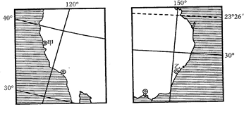 小题2:根据甲乙两城市所处的纬度位置和海陆位置分析,甲位于30°--40°之间的大陆西岸,故判断为地中海气候影响,夏季高温多雨,冬季温和多雨;乙位于30°--35°的大陆东岸,受亚热带湿润性季风气候影响,夏季高温多雨,冬季温和少雨,但由于甲乙两地所处的南北半球相反,故两地的高温期不同,而多雨期相同。