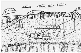 3、综合题 读岩石圈物质循环示意图,回答下列问题。(20分)