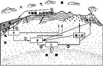 1、综合题  读地壳物质循环简略图,回答下列问题:10分