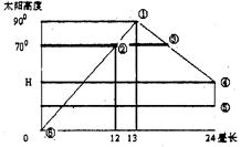 2、单选题 图为7月某日12时40分(北京时间),某经线上各地太阳高度与该经线上各地昼长的相关模式图。读图,回答1~2题。