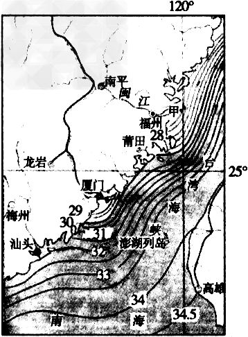 4、综合题 读我国近海某区域11月份多年平均表层盐度(‰)平面分布图,回答问题。
