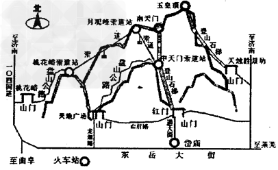 2、综合题 泰山是我国著名的风景名山,号称五岳之首,其旭日东升、晚霞夕照、黄河金带、云海玉盘被誉为四大奇观。下图为泰山旅游线路示意图。