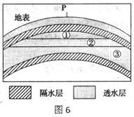 3、单选题  图6的背斜中,储存有石油、天然气资源,从P点向下钻井,当钻头位于①、②、③“层”时,可能分别探测到