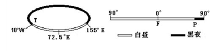 2.根据两地的经纬度位置:T(30°N,10°W),P地出现极夜,判断位于北极圈内,经度为72.5°E,判断P地位于T地的东北。