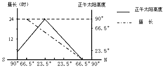 4、单选题 读沿45°E经线各地某时刻正午太阳高度和昼长分布图,回答(1)——(2)题。