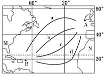 (1)图中a、b、c三条洋流中,属于盛行风吹拂形成的是?和________,它们分别是________带和_________带推动海水所形成的洋流。