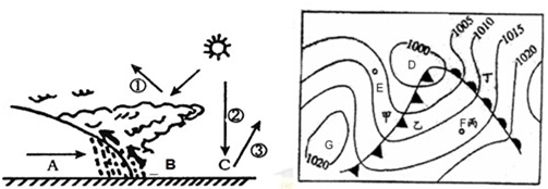 (1)左图中,根据锋面以下冷气团的运动状况(冷气团没有返回运动趋势)判断是冷锋。③箭头从地面指向大气(宇宙空间),属于地面辐射,地面辐射是长波辐射。左图中的B点位于该冷锋的锋前(冷锋的移动方向与冷气团一致),右图中乙也位于冷锋的锋前。