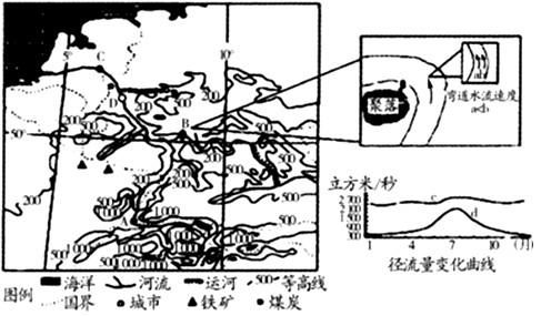 4、综合题 充分认识区域地理特征,因地制宜开发区域优势资源,发展经济,保护生态,有利于促进区域可持续发展。下面左图为世界某区域示意图,右图为径流量变化曲线图。读图回答下列问题。