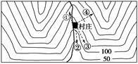 小题2:若下图为上图中某地等高线的一部分,虚线为泥石流发生时的四种逃生路线,图示村庄中的居民在泥石流发生时,其正确的逃生路线是图中①~④中的哪一条路线