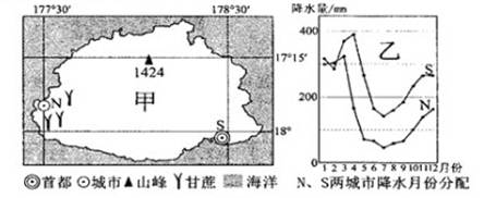 材料一:下图中甲岛是太平洋的一个火山岛,经济以农业为主,甘蔗制糖业是该岛最主要的支柱产业,蔗糖70%以上远销欧洲。乙图为N、S两城市降水月份分配图)。