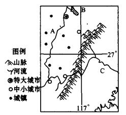 (1)根据图中经纬度判断该山脉是武夷山,位于福建和江西的边界上,西侧A所在省是江西省,图中特大城市是该省省会南昌市,东侧是福建省,C河是该省著名的河流闽江。