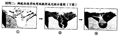 (4)在第四纪冰期,北欧为冰川覆盖,挪威西海岸的峡湾地貌〔材料二之图③)就是冰川作用的结果。描述挪威西海岸峡湾地貌的形成过程。(6分)