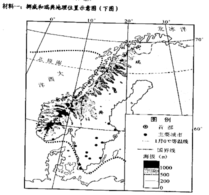 4、综合题 (28分)挪威和瑞典是北欧国家,斯湛的纳维亚山脉位于两国之间,根据下列材料,结合所学知识,完成各题。