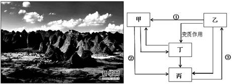 【小题1】从材料可知,组成环江喀斯特地貌的岩石是石灰岩。右图中乙通过变质作用变成丁,说明丁是变质岩,而甲和丁可以相互转化,说明甲是沉积岩,乙和丙可以相互转化,则乙、丙为岩浆和岩浆岩,因乙可以变成变质岩,说明乙是岩浆岩、丙是岩浆。