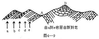 (1)地质构造的判断可以根据岩层的弯曲,也可以根据岩层的新老关系。中心岩层老,两翼岩层新的为背斜,反之为向斜,所以A为背斜,B为向斜。