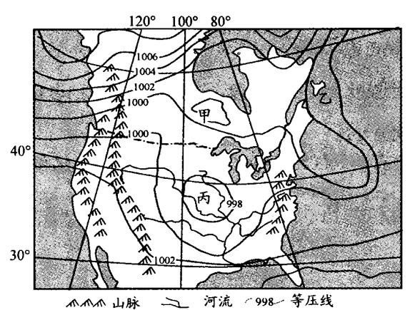 (3)此时影响丙地的天气系统是 。简述丙地此时的天气特征及原因。(4分)