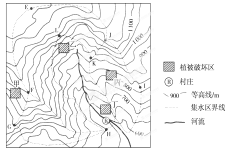 【小题2】若图中甲、乙、丙、丁四处植被破坏同等严重,且面积和土质状况基本相同。据此推测,暴雨发生时,会影响村庄R且泥、石等物质产生最多的是( )