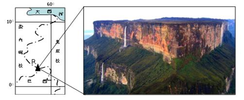 下图中R山海拔2180米,具有顶平、坡陡、麓缓的外观特征。R山顶部长约14千米,宽约5千米,主要由砂岩构成;山下生气盎然,猴子的吱吱叫声和金刚鹦鹉的鸣声此起彼落,四周覆盖着棉花糖般的云,边缘攀爬着前所未见的热带植物,上百条瀑布飞溅,被誉为“瀑布之乡”。