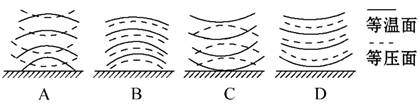 本题解析:①、③之间区域为城区,相对于郊区来说,城区气温高,气压低。所以,等温面向高空凸起,等压面凹向地面。